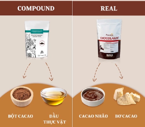 - Socola compound là loại socola phổ thông, có hàm lượng cacao chỉ dưới 15% và không chứa thành phần cacao mass. Thành phần thường sẽ thêm vào là các phụ liệu tạo hương vị như đường, lecithine, sữa bột, vani… Socola compound có vị ngọt hơn và thường được dùng để tạo hình trang trí, phủ bánh, tạo sủi. Đặc biệt, lớp phủ bóng đẹp, hương vị cacao đậm đà sẽ làm cho món bánh tráng miệng của trở nên tuyệt hảo hơn.