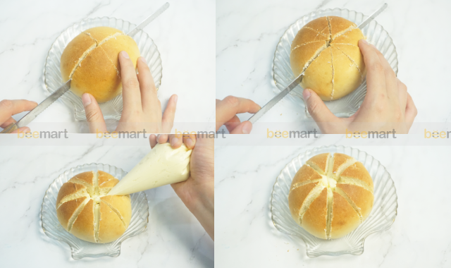 - Cắt đầu miệng túi bắt kem, bóp kem vào bánh mì đã cắt, lưu ý bơm kem cả vào các khe bánh