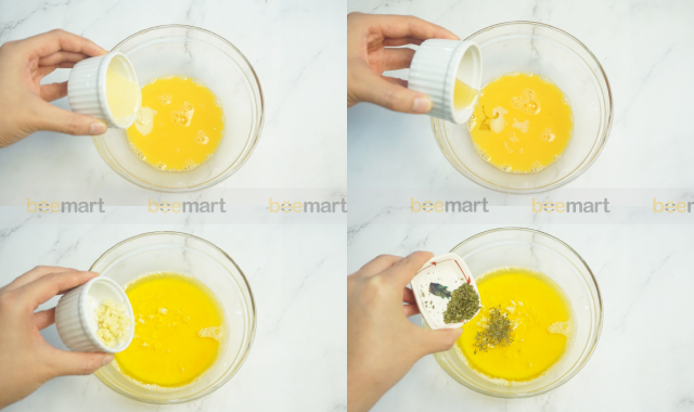 - Thêm 20g sữa đặc và 10g mật ong vào phần bơ đã đun chảy, trộn đều rồi thêm tỏi đã băm nhỏ và 10g lá basil vào, trộn đều