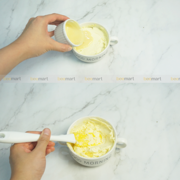 - Thêm 20g sữa đặc vào trộn đều cùng 100g cream cheese sao cho hòa quyện, hỗn hợp sẽ hơi sệt lại và rất mịn