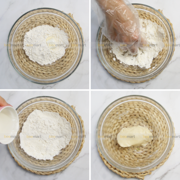 Bạn cho lần lượt 60g bột mì, 10g shortening vào tô, dùng tay trộn đều bột và shortening lại với nhau.