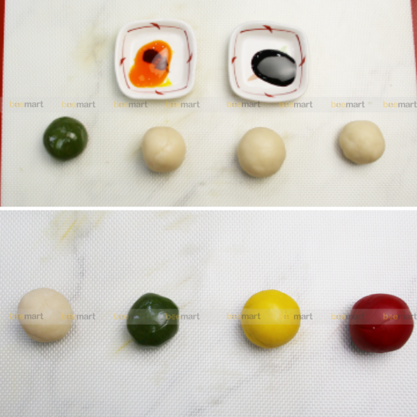 Để tạo được hoạ tiết nổi với màu sắc khác nhau, bạn chia bột thành 4 phần và tiến hành pha, trộn màu tuỳ theo ý thích nhé!