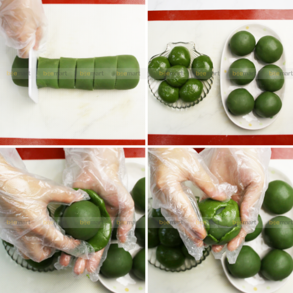 Chia 600g nhân hạt sen trà xanh thành 6 phần bằng nhau rồi vo tròn lại.