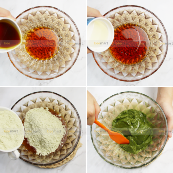 Thêm 170g bột trà xanh trộn sẵn vào tô, trộn đều đến khi không còn bột khô thì bọc màng bọc thực phẩm, để bột nghỉ trong 30 phút.