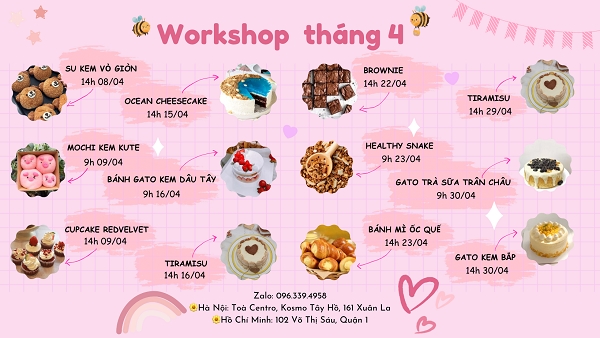 Mỗi workshop sẽ học về từng món bánh khác nhau, bạn có thể theo dõi thêm thông tin từ Beecake để cập nhật. Hoặc nếu như bạn có nhu cầu tổ chức workshop tại địa điểm mong muốn cũng có thể liên hệ để được hỗ trợ nha!