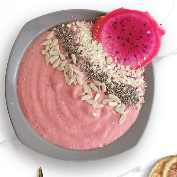 - Đổ ra bát. Trang trí topping. Do mình ko có dâu tươi nên mình trang trí với thanh long đỏ và rắc các loại hạt (có hạt hướng dương, chia và yến mạch).