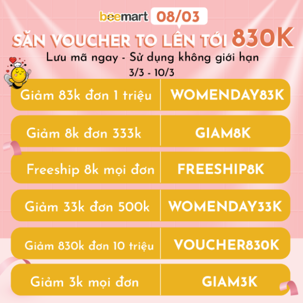 Chào mừng ngày Quốc tế Phụ nữ, Beemart dành tặng các chị em hàng trăm SẢN PHẨM HOT với GIÁ SIÊU SỐC trong vòng 8 ngày từ 3/3 - 10/3. Theo dõi ngay bài viết để không bỏ lỡ chương trình này nha!