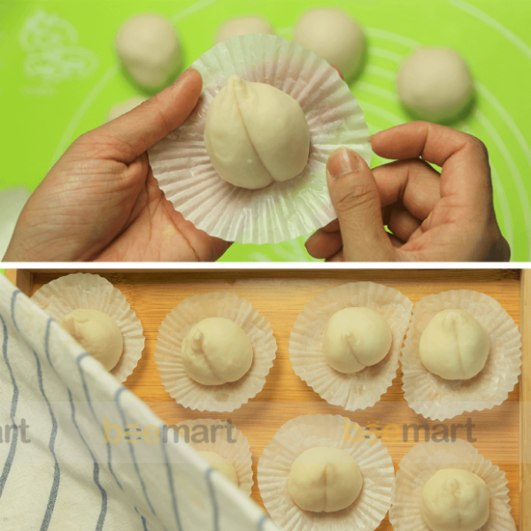 Đặt bánh lên giấy lót bánh, cho lên khay rồi dùng khăn sạch phủ kín hoặc bọc khay bột lại bằng màng bọc thực phẩm và mang đi ủ trong khoảng 45 - 60 phút.