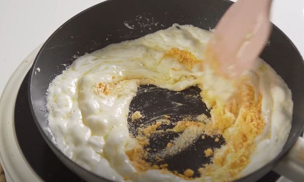 Đến khi Marshmallow tan chảy hết thì các bạn tắt bếp, đổ bột sữa và bột trứng muối vào đảo đều cho tan hết bột và hòa quyện với marshmallow.