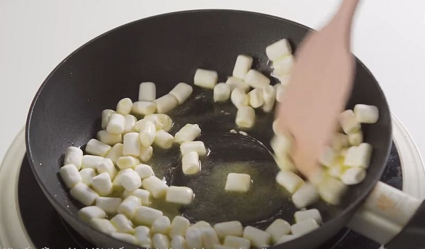 Cho 23g bơ + 10g socola trắng + 6g Corn Syrup vào một cái chảo chống dính và bắc lên bếp đun ở lửa thấp đến khi socola trắng và bơ tan chảy hết thì tiếp 50g Marshmallow vào đảo cùng.