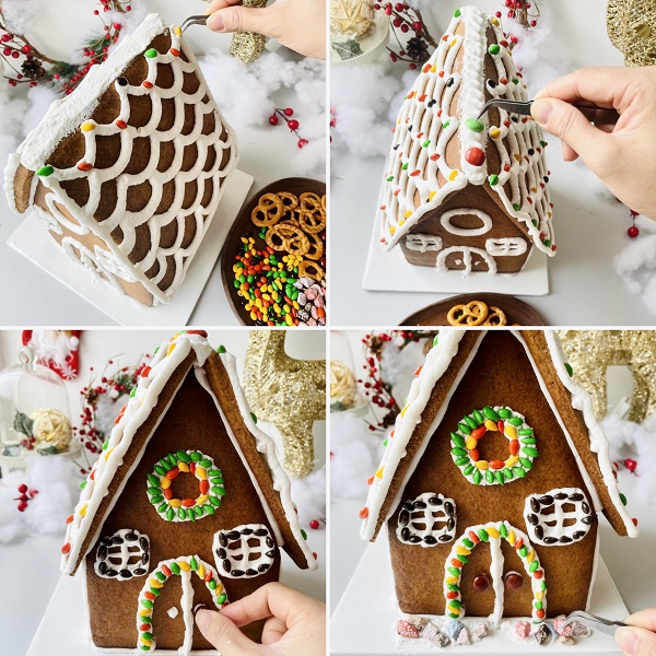 - Cuối cùng sau khi đợi phần icing trên bánh khô bớt, chúng ta sẽ bơm thêm đường icing lên các đường viền của ngôi nhà để tạo cảm giác tuyết đóng băng và rắc đường bột để tạo cho ngôi nhà có 1 lớp tuyết bao phủ
