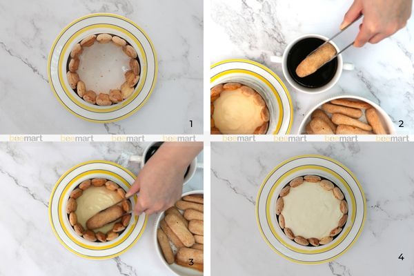 - Xếp bánh vào khuôn và xếp xen kẽ 1 lớp bánh đã nhúng hỗn hợp cà phê và 1 lớp kem. Sau đó để trong tủ lạnh 2-3h định hình bánh.