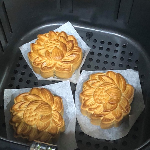 Làm bánh trung thu bằng nồi chiên không dầu thì phần đáy và mặt bánh sẽ không đều màu nhau do cơ chế của nồi chiên không dầu không bằng được lò nướng bánh. Vậy nên nếu muốn đều mặt thì sau lần nướng bánh 3, đợi bánh nguội và cứng hơn thì có thể cho lại vào nồi, úp ngược mặt lại, hướng đáy lên trên và nướng nhanh trong vòng 5 phút với nhiệt độ 180 độ C.