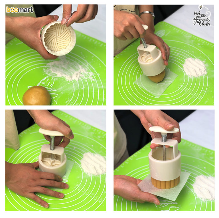 Bước 3: Chia thành 5 – 6 nhân ( mỗi nhân có trọng lượng 100g), vo tròn lại rồi dùng vỏ bánh bọc ra bên ngoài. Dùng khuôn tạo hình bánh rồi đem đi nướng.