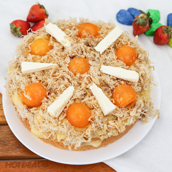 Cuối cùng, chúng ta rắc chà bông đều lên các khuôn bánh, đặt lòng đỏ trứng muối lên trên cùng.