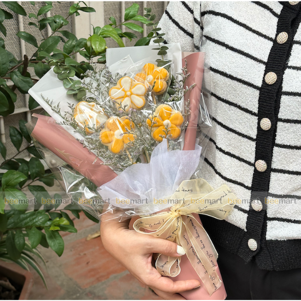 - Bó hoa gồm: 5 bông hoa bánh cookie icing tạo hình kèm hoa tươi, giấy gói hoa