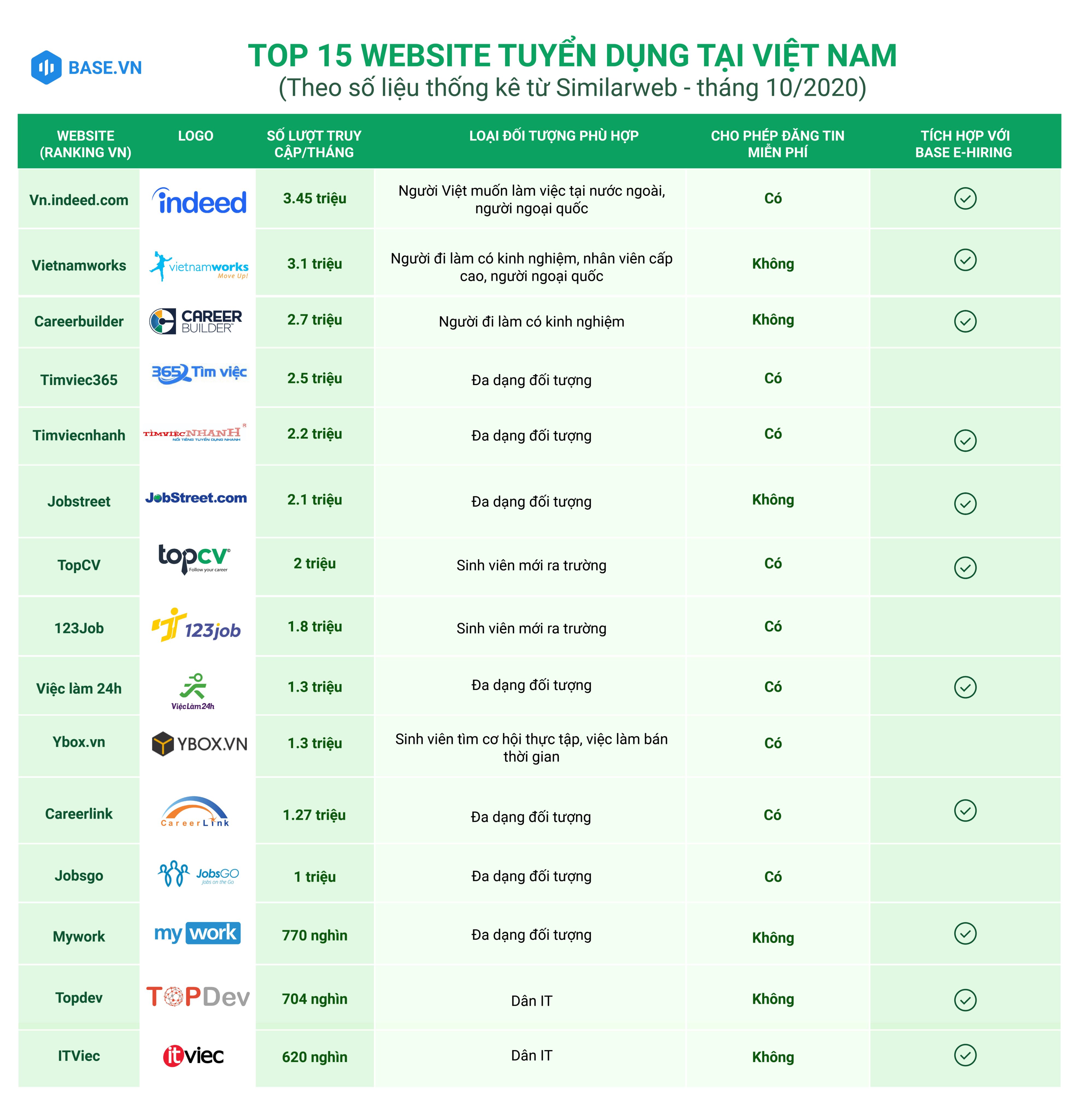 Hãy cùng Bee tham khảo thống kê về bảng xếp hạng "Top các website Tìm việc làm hàng đầu Việt Nam" dựa trên số liệu về lượt truy cập tham khảo từ chuyên trang Similarweb, vào thời điểm tháng 10/2020, cũng như những đặc trưng về lợi thế của kênh nhé: