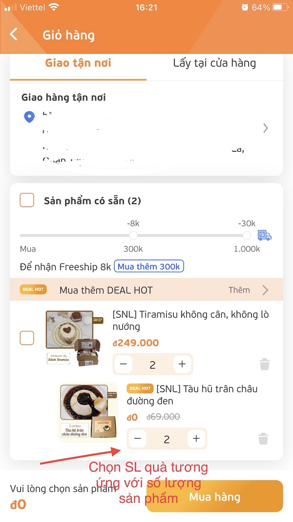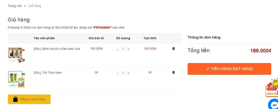 Bước 3: Sản phẩm và sản phẩm quà tặng sẽ được cho vào giỏ hàng, lúc này bạn tiến hành đặt hàng