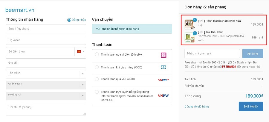 Sau khi chọn mua hàng, bạn chọn hình thức vận chuyển, cũng như áp dụng các mã giảm giá nếu có của nhà Bee là có thể Đặt hàng được rồi đó!