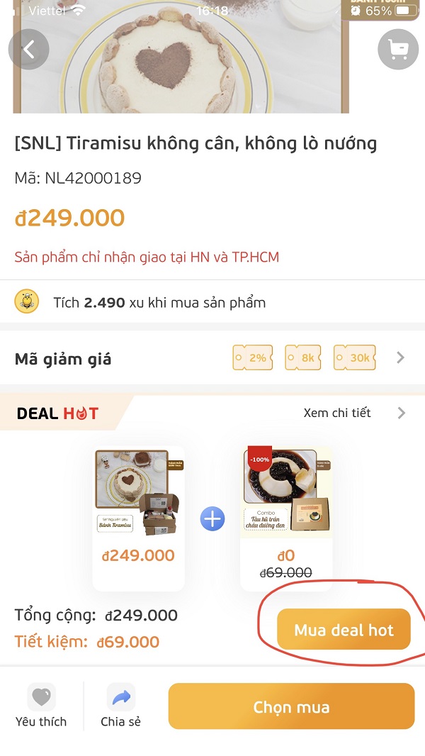 Bước 2: Sau khi đã lựa chọn được set nguyên liệu trong chương trình sale, tại trang sản phẩm bạn bấm nút MUA DEAL HOT