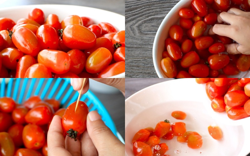 Cà chua bi rửa sạch, ngâm muối rồi dùng tăm đâm đều lên bề mặt. Ngâm chúng vào phần nước vôi trong qua đôi rồi vớt ra, rửa sạch cà chua nhiều lần với nước.