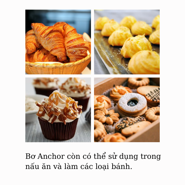Ngoài ra bơ khối Anchor còn có thể sử dụng trong những công thức nấu ăn hoặc làm các loại bánh ngọt như bánh croissant, bánh su kem, cupcake, bánh su kem hay các loại bánh quy,....