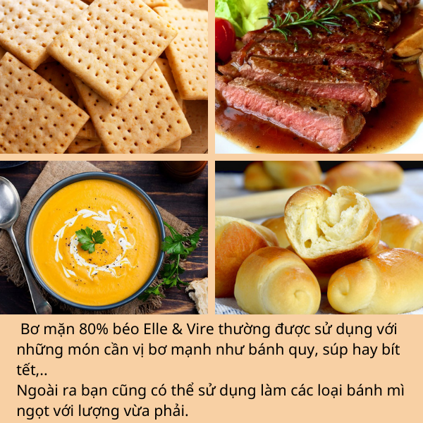 Với độ béo này Bơ mặn 80% béo Elle & Vire thường được sử dụng với những món cần vị bơ mạnh.Độ mặn của bơ nhẹ chỉ có 2% muối nên bạn cũng có thể dùng với cả các món bánh ngọt với lượng phù hợp mà không lo làm mất vị ngon của bánh đâu.