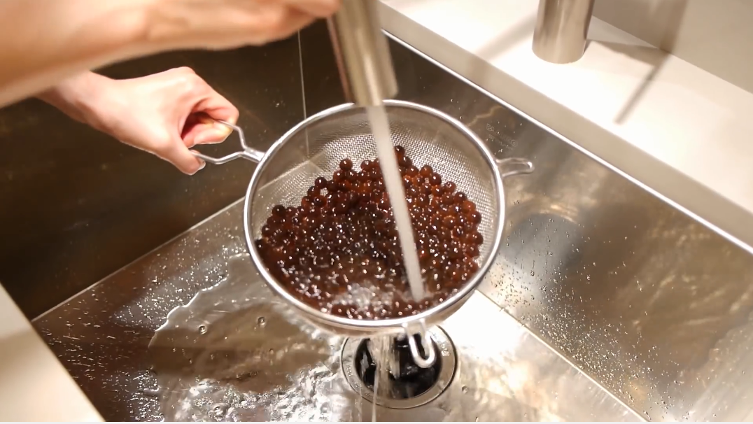 - Ngay sau khi luộc chín trân châu, bạn cần dùng rây hoặc vá để vớt hết trân châu ra khỏi nồi nước mới luộc.