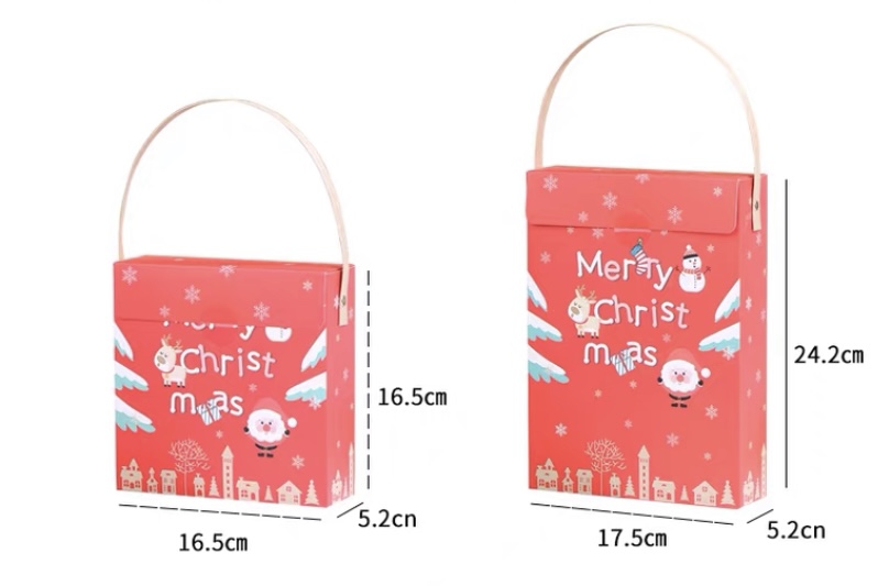 - Hộp có dáng chữ nhật đứng, có quai xách chắc chắn, có thể sử dụng đựng quà tặng trong dịp lễ giáng sinh như bánh cookie, kẹo gậy,....