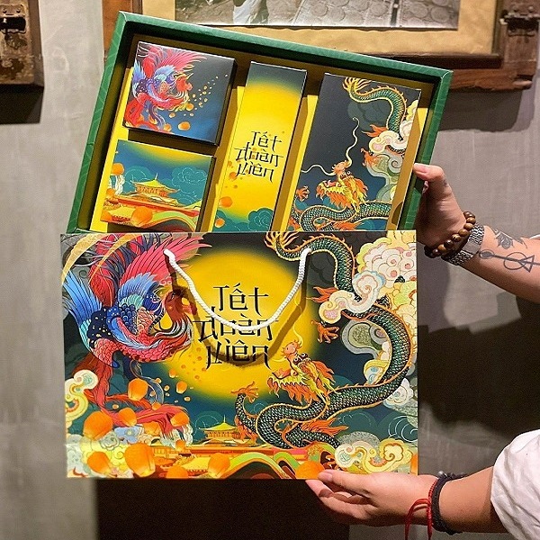 Hộp đi kèm túi đựng có quai xách tiện lợi và hộp con bên trong giúp bạn thuận tiện cho việc cầm hay di chuyền mà không lo ảnh hưởng đến chất lượng bánh bên trong. Không chỉ vậy mẫu hộp này còn có thêm hộp đựng trà giúp bạn có thể thêm vào đó những gói trà thơm ngon để tặng người thân nhân nhân dịp lễ Trung Thu.