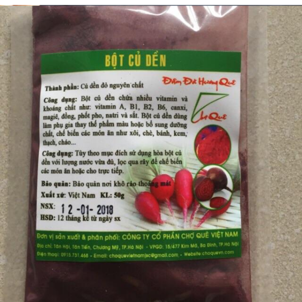 - Bột củ dền 50g sử dụng để tạo màu đỏ hồng, thay thế màu thực phẩm cho nhiều món ăn và thức uống khác nhau: xôi, chè, bánh, kem, thạch cháo,...