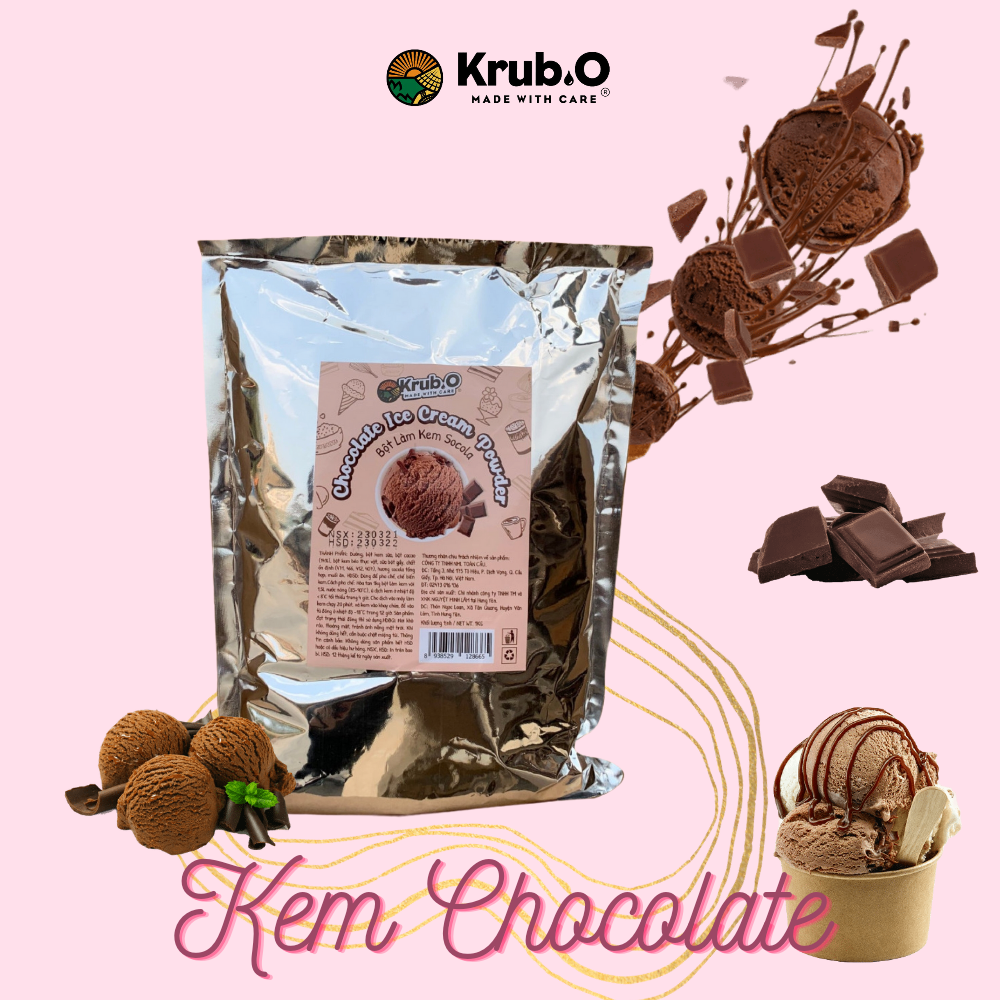 Thành phẩm kem được làm từ bột làm kem Krub.O mang đậm hương vị socola, có màu nâu nhạt, vị đắng nhẹ và ngọt dịu. Đây cũng là một trong những vị kem phổ biến nhất trên thị trường được nhiều người ưa chuộng. Bạn có thể kết hợp cùng một số loại topping khác để tăng thêm sự trải nghiệm mới lạ như choco chip, các loại hạt nghiền, sốt chocolate, cốm nhiều màu, bánh quy ....