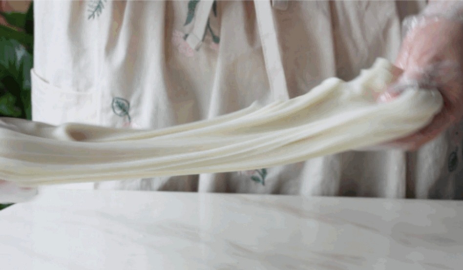 Để hỗn hợp vẫn còn hơi nóng , đeo bao tay vào . Nhào và kéo hỗn hợp bột cho mềm và dẻo hơn.