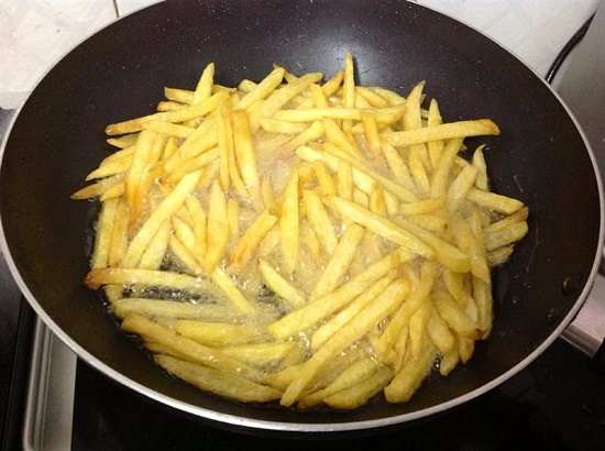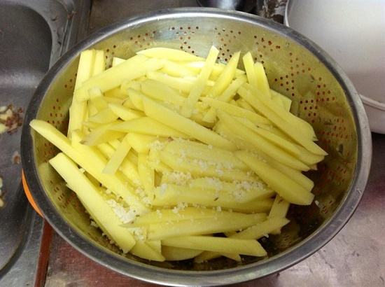 - Cho dầu vào chảo, đun dầu cho nóng. Khi dầu nóng đều, thì cho khoai vào chiên sơ. Bước này chỉ chiên sơ khoai vừa chín tới. Vớt khoai ra đĩa có lót giấy thấm dầu. Rồi bỏ khoai vô ngăn đá cho se bề mặt.