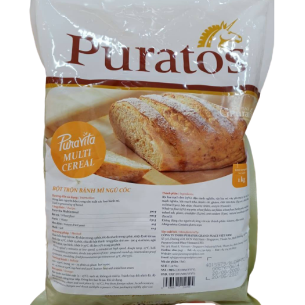 Bột trộn bánh mì ngũ cốc Puravita 1kg cung cấp 16% lượng chất xơ hàng ngày. Đã bao gồm phụ gia S500 Acti-Plus (không chứa Bromate) với hương vị bột lên men tự nhiên độc đáo. Với thành phần chủ yếu gồm: lúa mì, lúa mạch đen, bột đậu nành, bột yến mạch thô và lúa mạch, sản phẩm sẽ mang hương vị thơm ngon đặc trưng của ngũ cốc, chứa hàm lượng dinh dưỡng cao và cung cấp khoáng chất cho cơ thể. Quy trình xử lý đạt chuẩn an toàn vệ sinh thực phẩm. Quy cách đóng gói 1kg với giá thành rẻ hơn, tiện lợi trong việc mua sắm, phù hợp với các khách hàng lẻ mua về sử dụng cho gia đình.