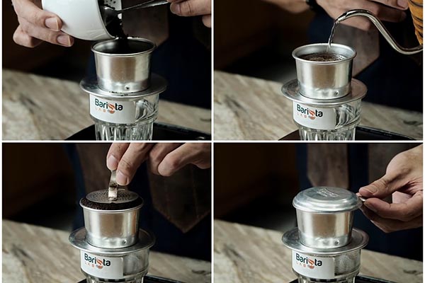 Tiến hành pha cà phê bằng cách pha phin truyền thống. Sử dụng nước sôi để tráng phin pha cà phê để phin sạch hơn, đồng thời ngâm dụng cụ đựng cà phê sẽ giúp hạt cà phê nở đều.