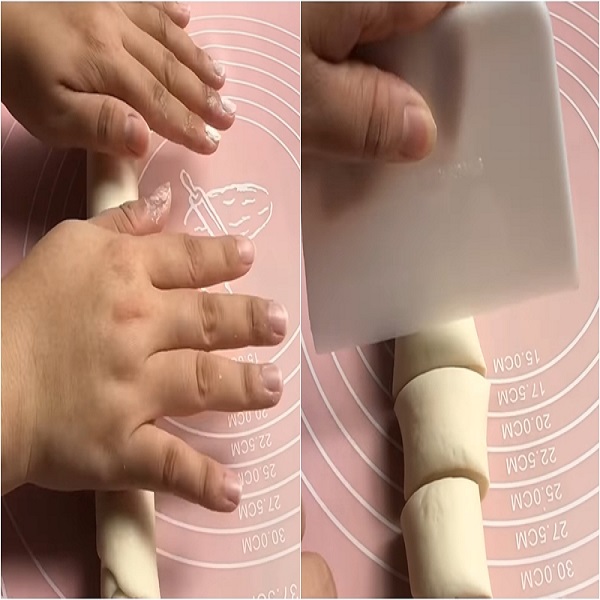 - Tạo hình thì các bạn cán bột thành viên dài, để nén và đẩy bột khi ra ngoài và nhào nặn tầm 5 phút nữa thật mịn, không dính tay rồi mới bắt đầu tạo hình tùy ý.