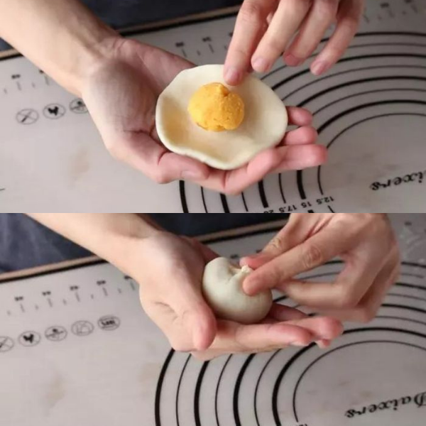 - Chia bột thành mỗi viên 30g, sử dụng cán lăn bột để ấn dẹt bột, đạt viên nhân vào giữa rồi gói lại. Vê thật tròn các phần bánh, đặt phía dưới giấy lót bánh để chống dính lúc hấp. Với công thức như chúng mình chia sẻ, sẽ làm được 12-14 chiếc bánh có trọng lượng 50g.