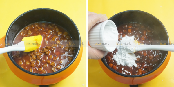 Thêm 60g nước lọc vào phần thịt, đun nhỏ lửa trong 10 phút cho cạn bớt nước thì bạn thêm 10g bột năng cho phần nhân sệt lại, để nhân nguội hoàn toàn.