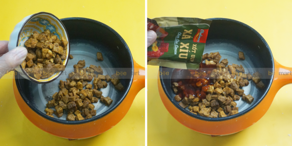 Trộn thịt xá xíu cùng phần sốt ướp thịt và ướp trong 5-7 phút cho thịt ngấm gia vị.