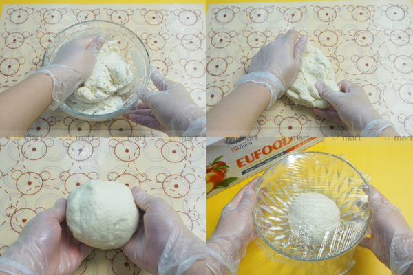 Bạn đổ bột ra tấm nhào bột rồi nhào khoảng 10 - 15 phút đến khi sờ vào không dính tay. Sau đó đậy màng bọc thực phẩm và ủ bột trong 30 phút.