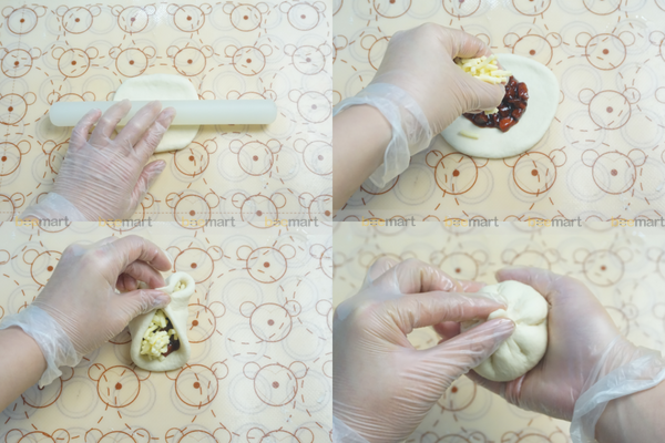 Thêm nhân xá xíu và phô mai vào giữa rồi bọc nhân lại, có thể tạo thành hoa hoặc hình tròn sao vỏ bọc kín nhân là được.