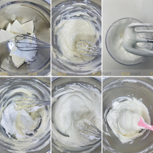 Bước 3: Trộn đều hỗn hợp whipping và hỗn hợp phô mai tới khi hòa quyện thì dừng lại cho vào túi bắt kem và cất cào tủ lạnh tới khi dùng.