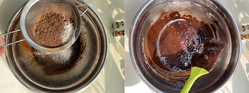 Đổ chung bột cacao và bột mì rây mịn rồi chia hỗn hợp làm 3 và đổ từ từ vào hỗn hợp socola trên. Dùng phới trộn đều hỗn hợp tới khi không còn bột khô.