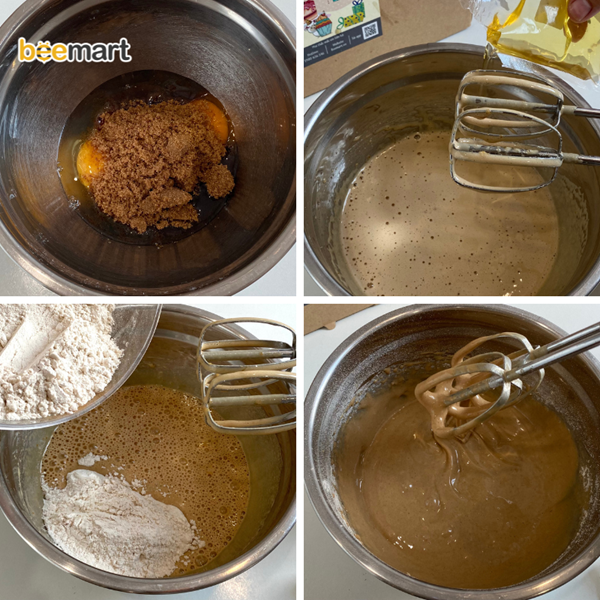 - Đánh 2 quả trứng với 100g đường cho đường tan hết, hỗn hợp chuyển qua màu nâu nhạt thì từ từ đổ dầu ăn vào đánh đều (nên chia dầu ăn thành 3,4 lần để đổ vào từ từ), bạn sẽ thu được hỗn hợp trứng mềm mượt quyện dầu và vẫn giữ được độ bông nhất định.
