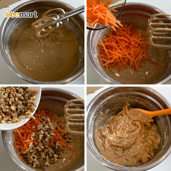- Tiếp tục cho carot, hạt óc chó đã chuẩn bị vào và trộn đều hỗn hợp. Đoạn này trộn nhanh tay rồi đổ khuôn.