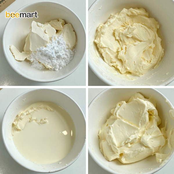 - Tán nhuyễn 120g Cream cheese (đã để hết lạnh ở nhiệt độ phòng) với 30g đường bột. Khi thu được hỗn hợp nhuyễn mịn thì thêm vào đó 80g whipping rồi trộn đều cho hòa quyện.