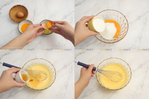 Bạn thêm bột mì và bột vani vào hỗn hợp trứng ở bước 2, khuấy 1 chiều từ 3-5 phút.