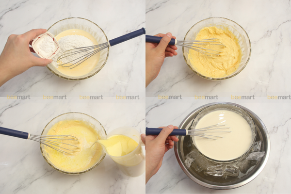 Chia phần sữa nóng ở bước 1 thành 3 phần, cho từ từ vào và khuấy đều. Lúc này hỗn hợp nóng nên khuấy đều dưới 1 tô nước đá 15-20 phút đến khi hỗn hợp bên trong lạnh.