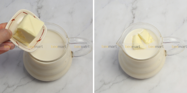 Trước tiên, bạn cần đun bơ với sữa tươi không đường trong lò vi sóng chế độ cao nhất 2 phút.